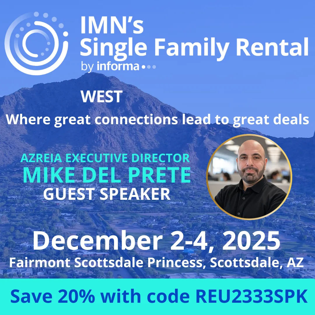 Join us at the 13th Annual Single Family Rental West (Dec 2-4, 2025 • Fairmont Scottsdale Princess) — the largest gathering of SFR owners, operators and capital providers in the Western U.S. Tap into game-changing deals, hear from 200+ industry leaders, and build real connections that translate into business. Don’t miss the moment where “who’s who” in single-family rentals meets — and makes things happen. Don't miss AZREIA's own Executive Director Mike Del Prete as he takes the stage on Wednesday! Save 20% with code REU2333SPK