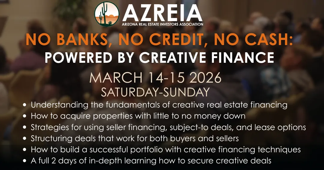 Are you wondering how to get into real estate but you're facing roadblocks with credit, or lack of financial resources.? Join AZREIA for an exclusive 2 day workshop tailored to solve these challenges. This workshop will cover the essential strategies to unlock creative financing solutions for your real estate deals. Whether you're new to real estate investing or looking to sharpen your skills, this workshop will provide you with the tools to succeed in today’s market.